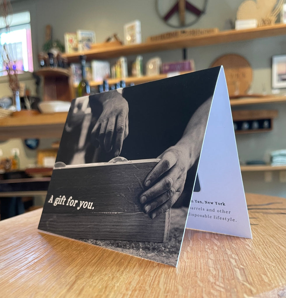 Our gift cards can be redeemed both in our Penn Yan store and online, making them perfect for locals and visitors alike. Whether they explore our shop in the heart of the Finger Lakes or browse our online store, they’ll have access to our full range of sustainable, handcrafted products.
