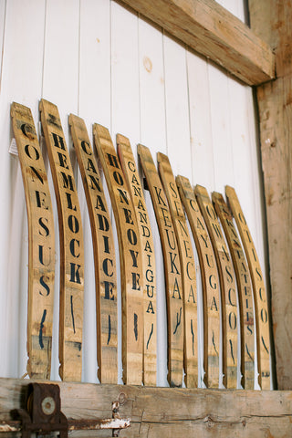 A set of 11 Painted Wine Barrel Signs, each with the name and shape of the different Finger Lakes. All together these make a statement and fills a large wall space with warmth and interest. Or, separately, they could each be placed in different spots all over a home or business. Maybe a Bed & Breakfast could have one in each room!
